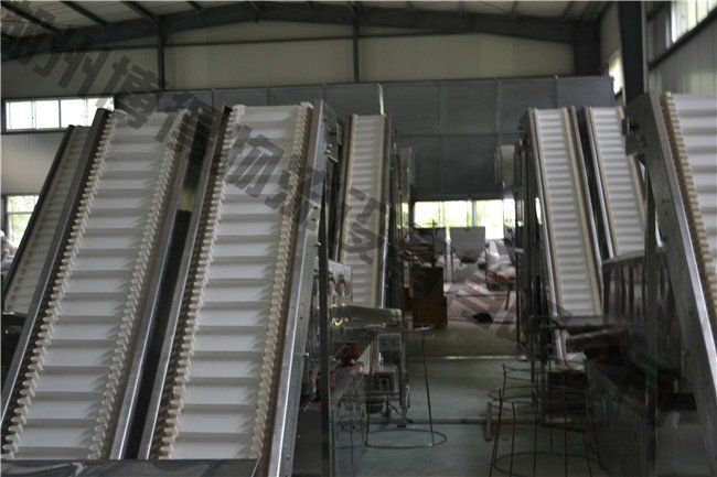 爬坡皮帶機是爬坡皮帶輸送機的簡稱,是皮帶輸送機的一種。爬坡皮帶輸送機運用輸送帶的連續(xù)或間歇運動輸送500kg以下的物品或粉狀、顆裝物品。爬坡式皮帶輸送機運用于有高低差的輸送情況下,可完成連續(xù)輸送,能平滑的與滾筒輸送機或鏈板輸送機接駁。 爬坡皮帶機輸送帶的材質(zhì)有:帆布帶(或尼龍帶)、塑膠帶、防靜電PVC帶、橡膠帶(重的物體采用帶鋼絲的橡膠帶)、金屬網(wǎng)帶等。爬坡皮帶機輸送的角度*好不要超過13度,如果超過13度要在皮帶表面增加擋條或者皮帶要選擇帶有摩擦的草帶。在制作爬坡皮帶機時通常要在皮帶機兩側(cè)腰邊增加防護欄或在皮帶的側(cè)邊增加裾邊,以防止物體在輸送過程中跌落。